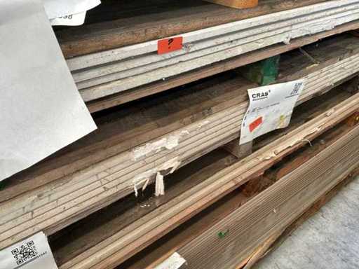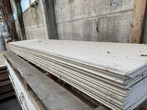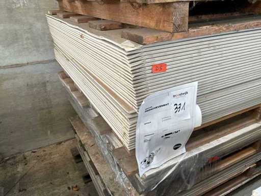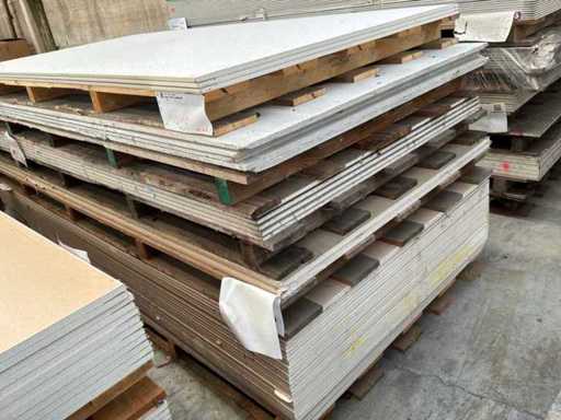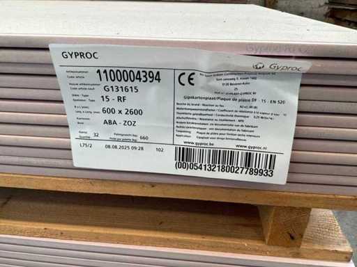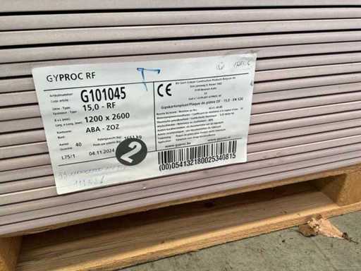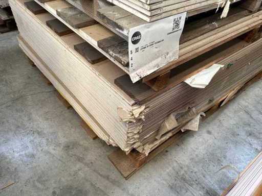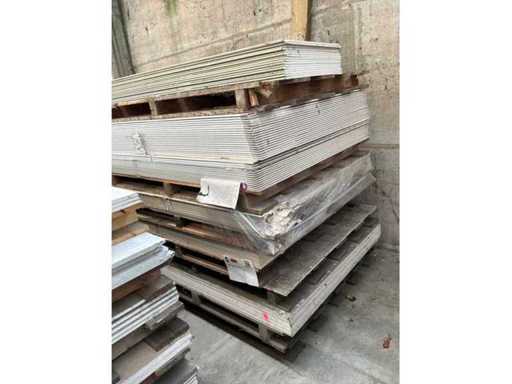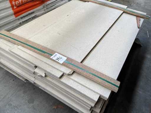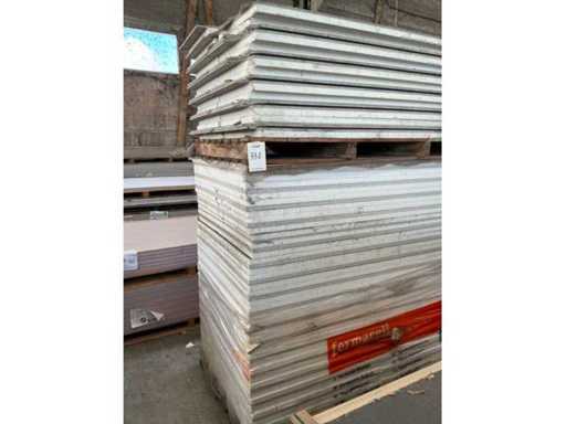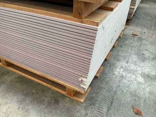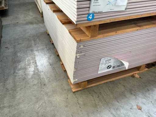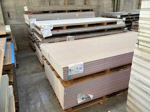 Including 24x plasterboard with dimensions 15 x 600 x 2600 mm, 26x plasterboard with dimensions 15 x 1200 x 2600 mm, approximately 30x plasterboard with dimensions 9.5 x 1200 x 2600 mm. As well as 36x Fermacell plasterboard with dimensions 40 x 1000 x 1500 mm