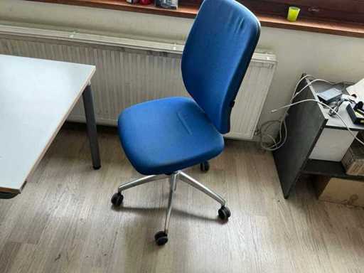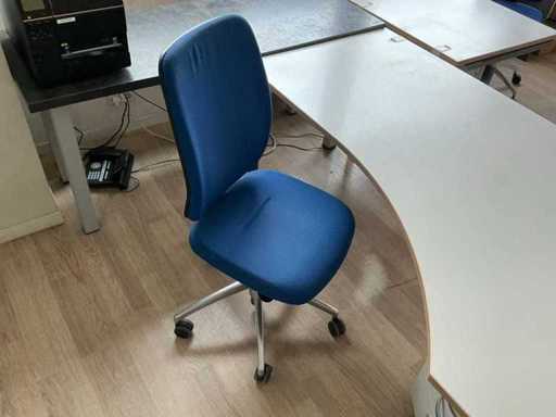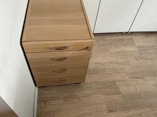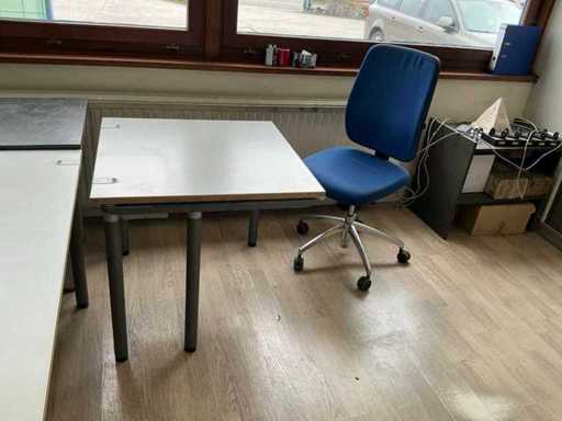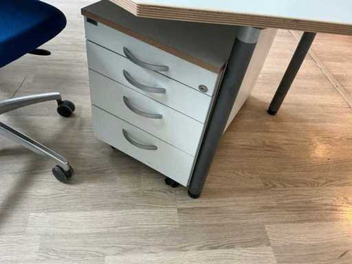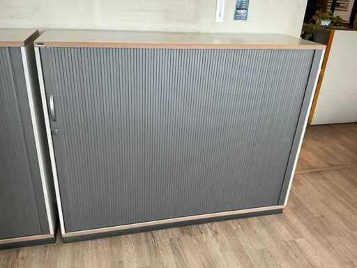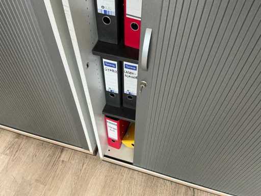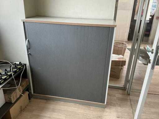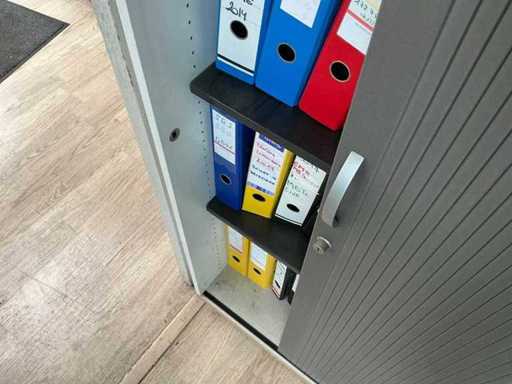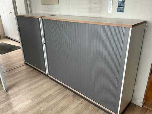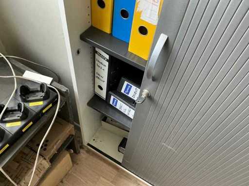 With 2x office chairs, 3x Geka roller door cabinets size 100x44xH127cm, 120x44xH127cm, 160x44xH127cm, 2 drawer units and table size approximately 80x80xH73cm.