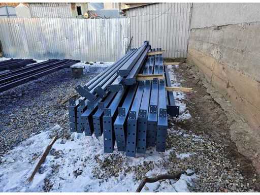 The structure consists of: 2 beams (trusses) on the ends from IPE 160 profile; 4 intermediate beams (trusses) from IPE 200 profile; 4 end posts from IPE 160 profile; 8 intermediate posts from IPE 200 profile; 3 door posts from square pipe 100x100x4; 5 pressure uprights from 76x4 pipe; wind bracing for beams and posts made of galvanized steel with 16 mm tensioner;