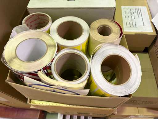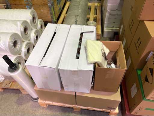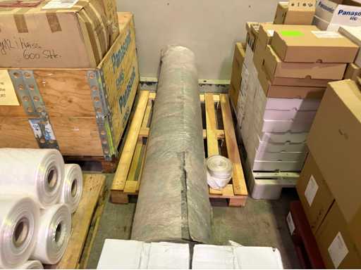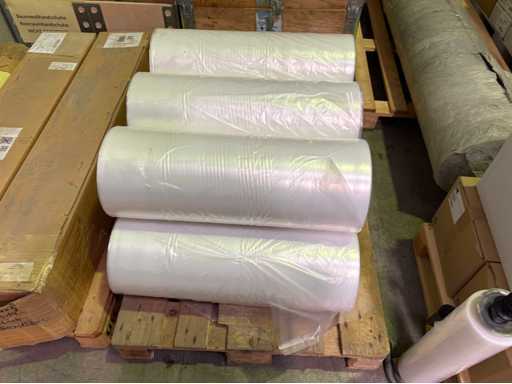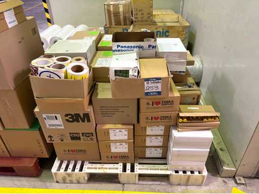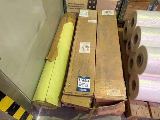 Ten pallets of assorted factory consumables to include Vacupac foil rolls, cleanroom sticky floor mats, labels, shrink wrap, polythene plastic rolls and sheets, felt roll, cotton work gloves etc.
