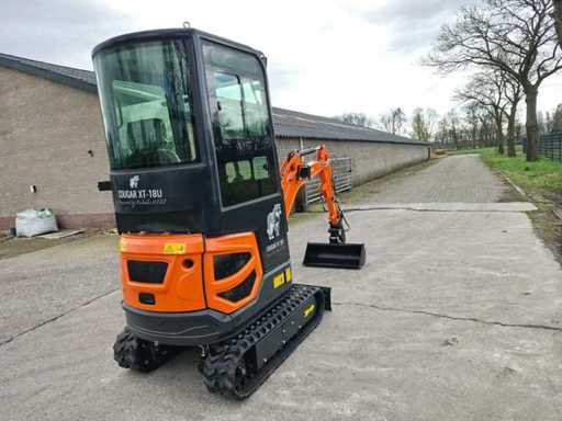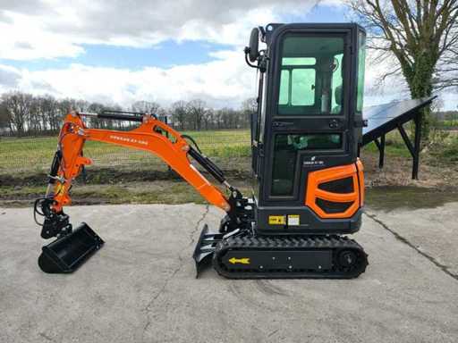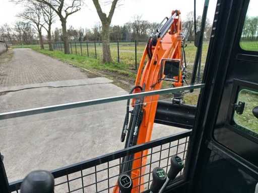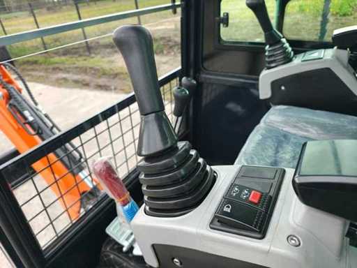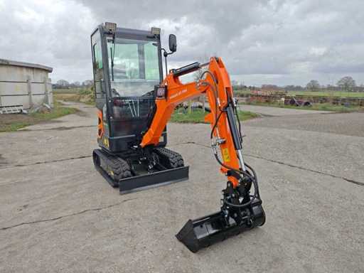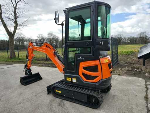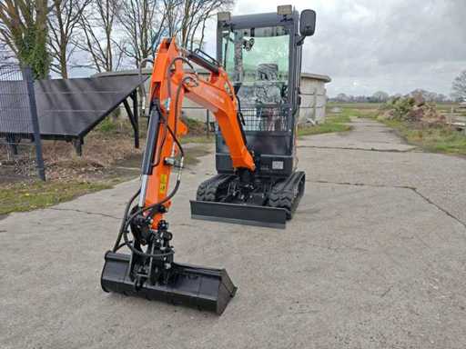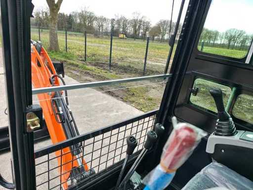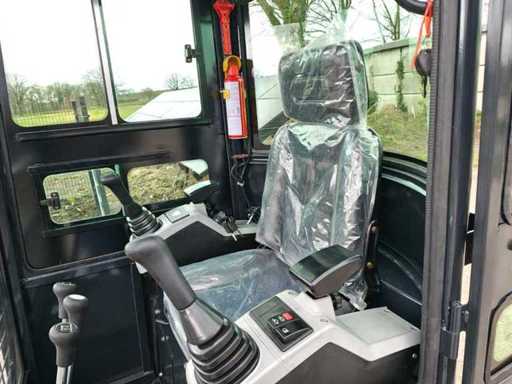 1800 kg mini excavator with 3 cylinder Kubota D722 eur5 diesel engine of 10.8 KW. Equipped with servo control. Equipped with cab, swing boom with radius of 1500mm, dozer blade 1100mm, hydraulic bucket change system, hydraulic pump 22L/min, breakout force 10KN, tank capacity 9.5 liters. Unused machine