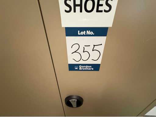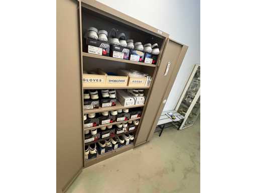 Double-door storage cupboard including shoes, hoods, gloves and over-shoecovers. Cupboard size Approx. 1.96 m × 950 mm × 400 mm.