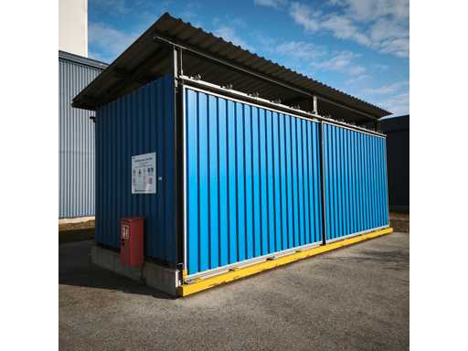 Material-/Lagerbehälter mit seitlichen Rolltüren auf beiden Seiten, verzinktes Stahlunterbauwerk mit blauen trapezförmigen Paneelen, montiert auf einem Betonsockel. Abmessungen LxWxH in cm 800x345x350