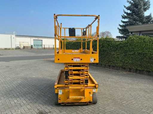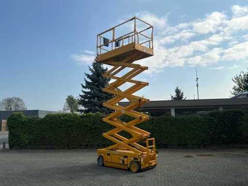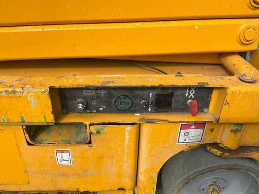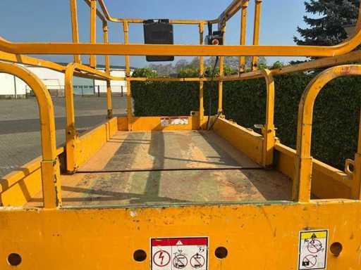 Ausgestattet mit: 24V-Gleichstrommotor, Batterieladegerät mit automatischem Stopp, Batterieladeanzeige, integrierten Gabelstaplerfächern, proportionaler Hebe- und Antriebsrad, 2 vorderen Lenk- und Antriebsrädern, klappbaren Handläufen, massiven unmarkierenden Reifen, Bremsentriegelung, ausklappbarem Bauteilkasten, Lastmanagementsystem auf der Plattform, Stundenanzeige, Hupe, abnehmbarer Steuerbox auf der Plattform, manuelles Ventil zum Absenken der Plattform, Betriebshöhe 13,80 m, Plattformhöhe 11,80 m, Plattformmaße in (LxW) 2,74x1,20 m, Bahnsteigmaße nach außen (LxW) 3,22x1,20 m, Bahnsteigverlängerung 0,92 m, maximal. Hebekapazität 350 kg, maximal. Hebekapazität, ausfahrbare Plattform 120 kg, Transportmaße. (LxWxH) 2,49x1,20x2,50 m, Transporthöhe einschließlich Zaun 2,50 m, Transporthöhe exz. Zaun 2,08 m, Gesamtgewicht 3.175 kg.