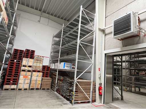 17 Felder mit boltlosen Stahlpalettenabsteller. 5 m hohe Pfosten, 2,7 m große Querträger mit Stahlabdeckungen. Insgesamt 175 Querträger.