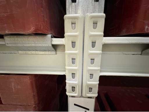 Fünf Felder mit boltlosen Palettenträgern, bestehend aus 6 x 4 m x 1 m Aufrechter, 24 x 2,7 m Querträgern, 6 x 1,2 m Querträgern einschließlich Regaleinsätzen. Inhalt der Paletten ist nicht enthalten.