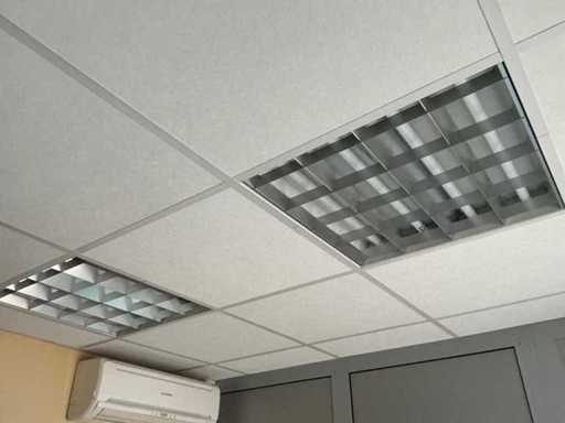 Ausgestattet mit Kabelkanälen mit Steckdosen und Datenanschlüssen. 3X Mitsubishi Innengerät. Eingelegte Fliesendecke mit 9x vierfacher Leuchtstoffröhren.