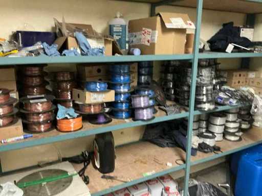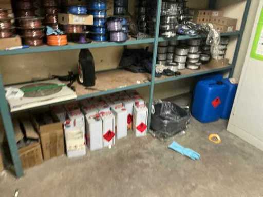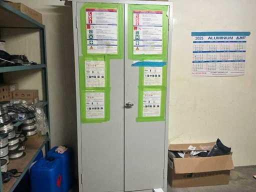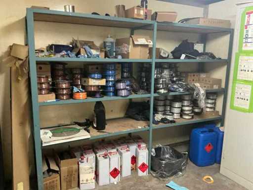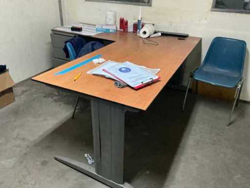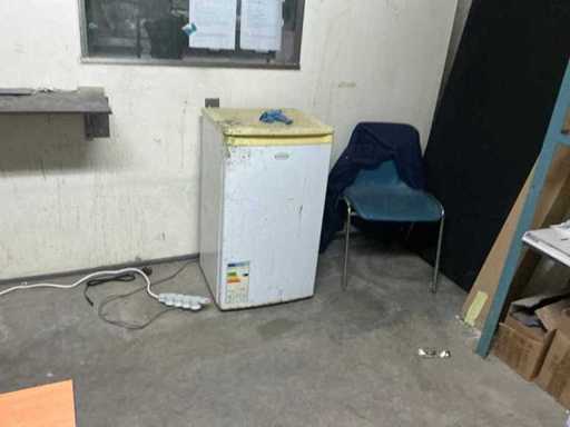 Bestehend aus: Schreibtisch, 3 Stuhl, 2-türiger Metallschrank, Lagerregal mit verschiedenen Stromkabeln, Kühlschrank