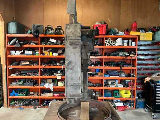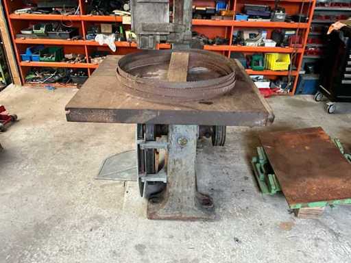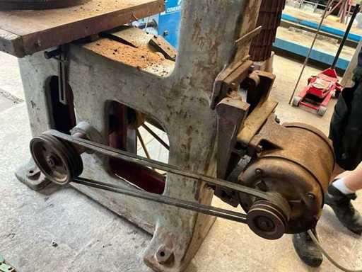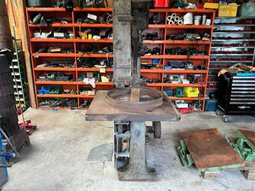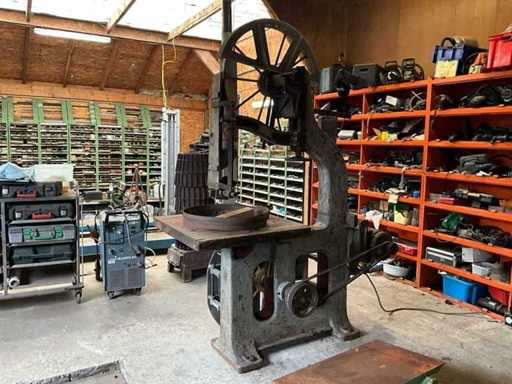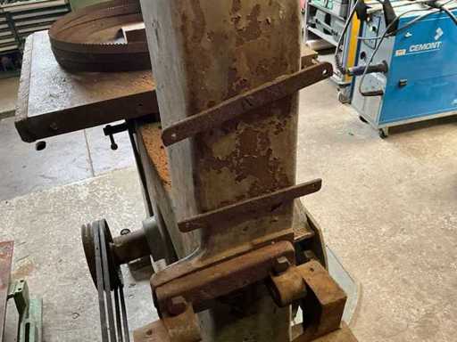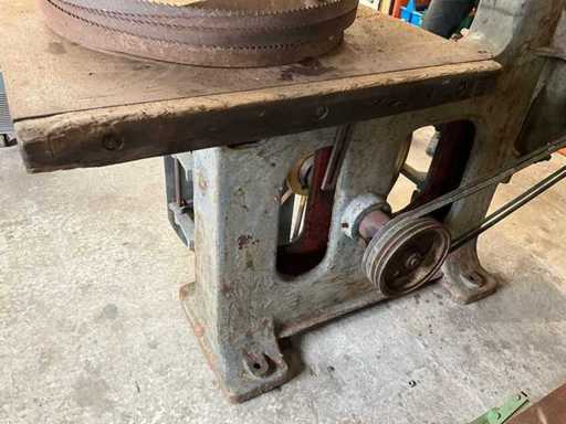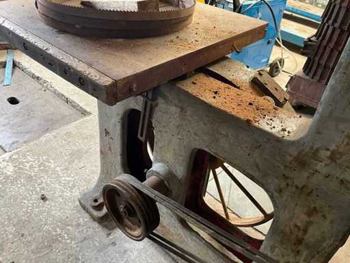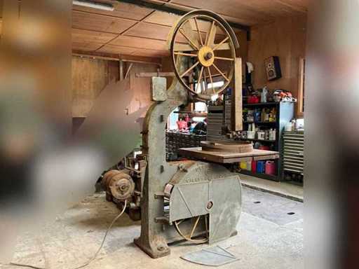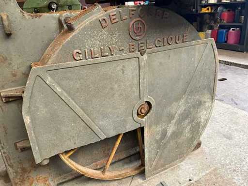 Sehr robuste, industrielle Vertikalbandsäge von der Marke DELFOSSE. Diese Maschine ist aus massivem Gusseisen gebaut und für den Langzeiteinsatz in Werkstätten und Sägewerken konzipiert. Angetrieben durch Riemenantrieb (Antriebskraft) mit großem Schwungrad, typisch für ältere Industriemaschinen.