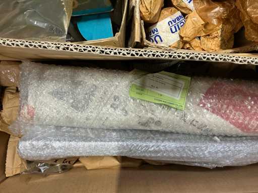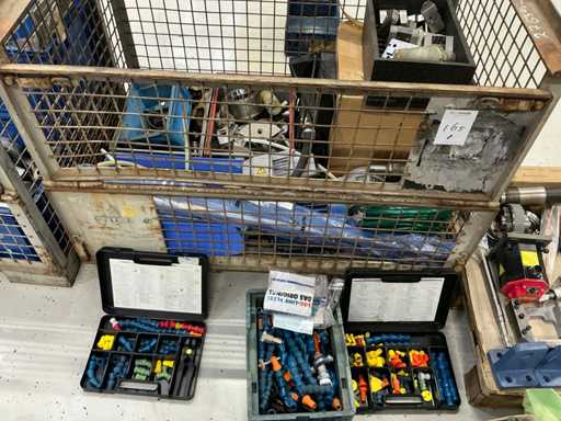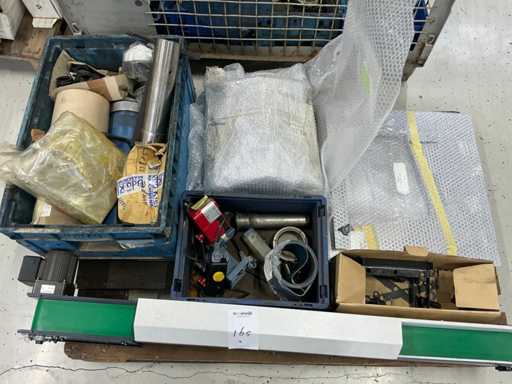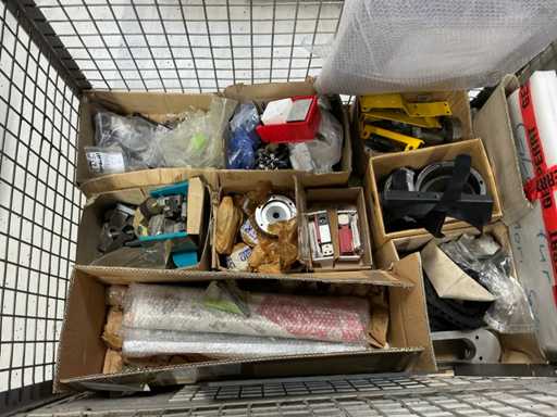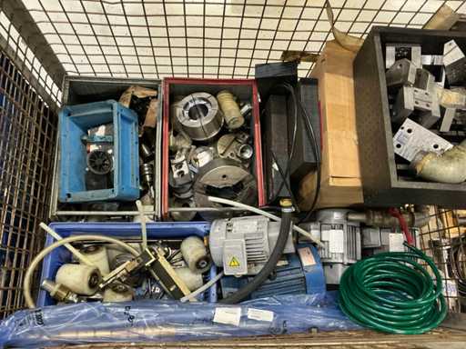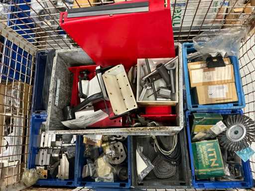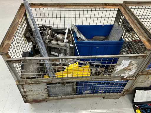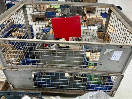 9 Paletten und Netzbehälter mit verschiedenen Teilen