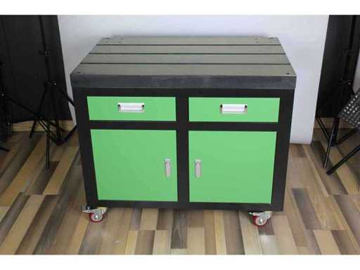 4 EINHEITEN/SETS LON0017 ZUSAMMENGEPACKT. EIN EINZEL LON0017 ENTSPRICHT: Schwermetall-Werkstattschrank mit 2 Türen und 2 Schubladen. Auf Rädern mit hoher Lastkapazität montiert. Obergröße 900 x 600 mm, Schrankgewicht 85 kg