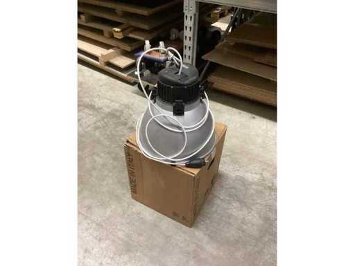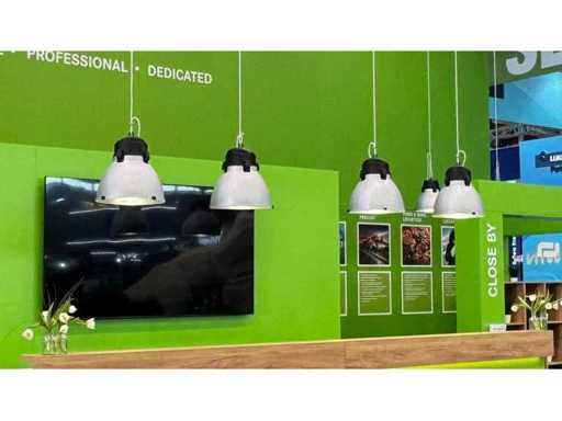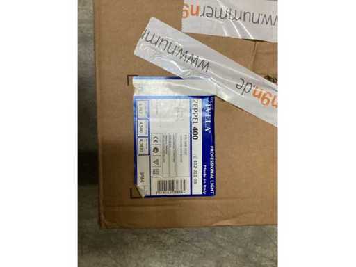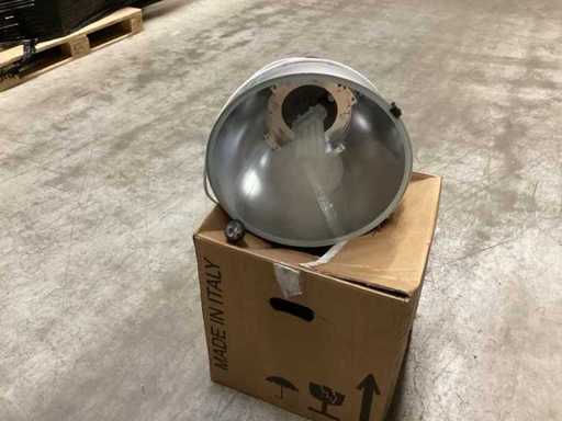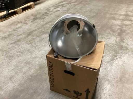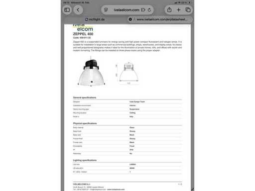 Hallentiefstrahler, ZEPPEL 400, 1 x E27/100W Kunststoff schwarz Metall-Floodreflektor mit Schutzglas ohne Aufhängung (Kette) Abmessungen: Ø 412 Reflektorhöhe 265 Gesamthöhe 293 Technische Daten siehe Datenblatt unter Bilder