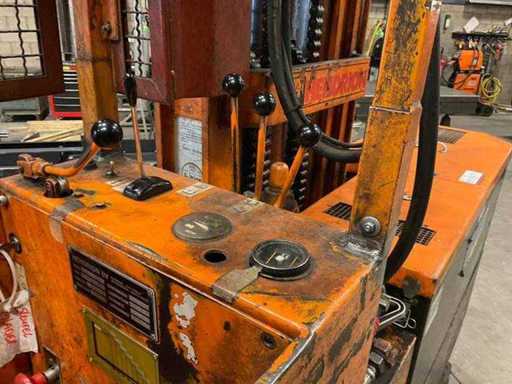 Seitenlader-Gabelstapler, der für den Umgang mit langen und sperrigen Materialien wie Rohren, Profilen und Holz konzipiert ist. Die Maschine ermöglicht seitliches Beladen und Transport, was sie für Lagerhäuser und industrielle Umgebungen mit begrenztem Platz geeignet macht.