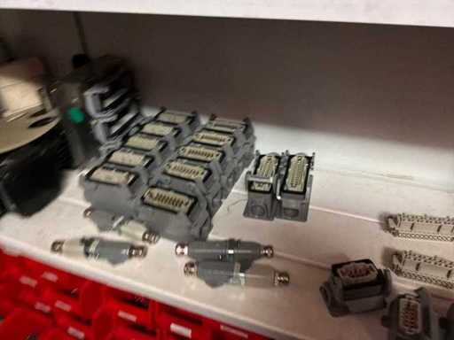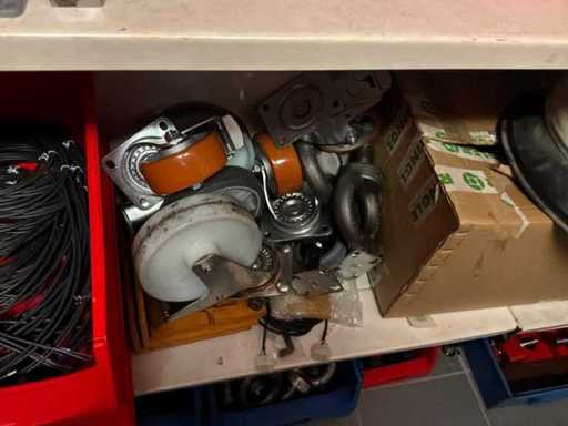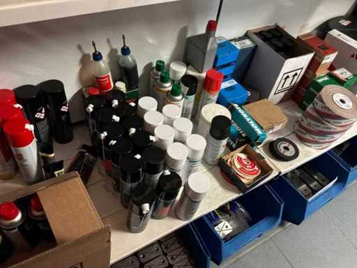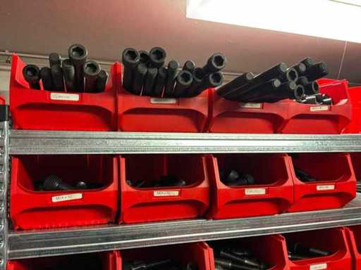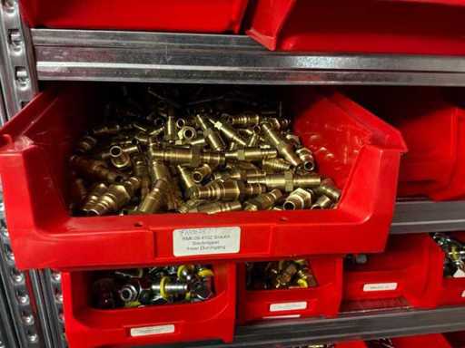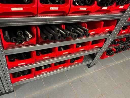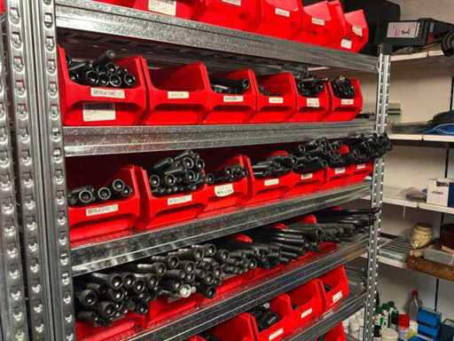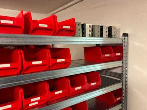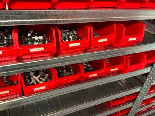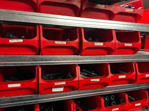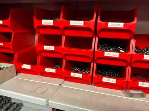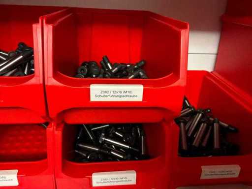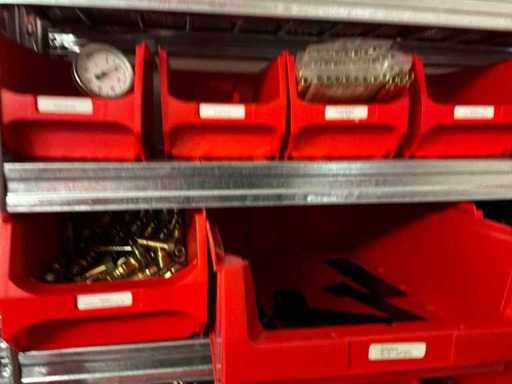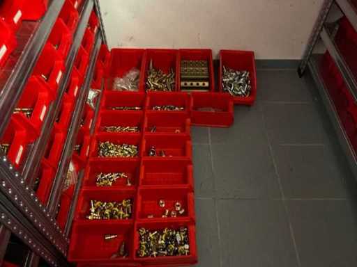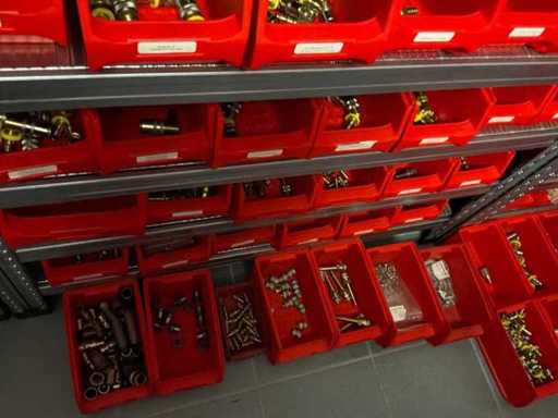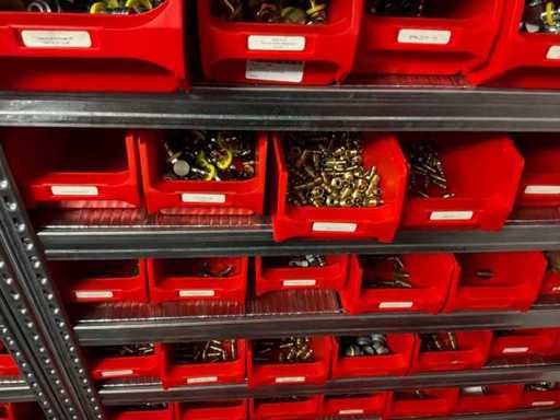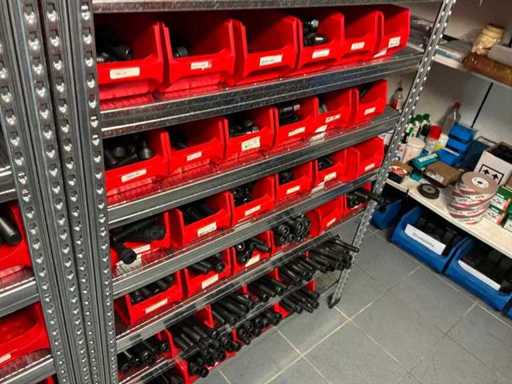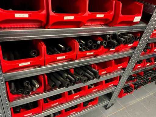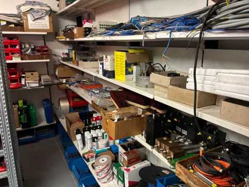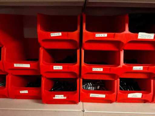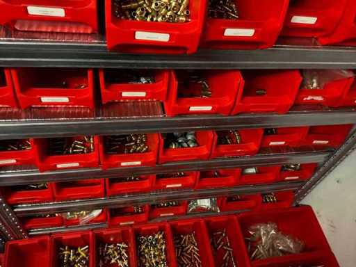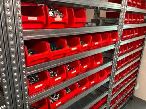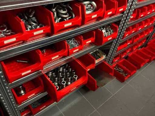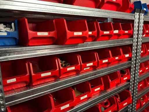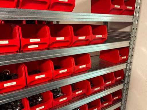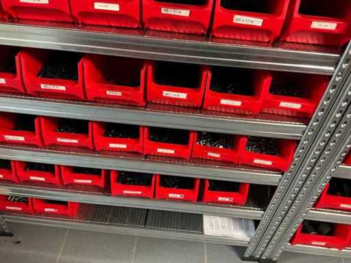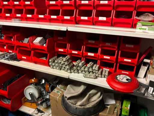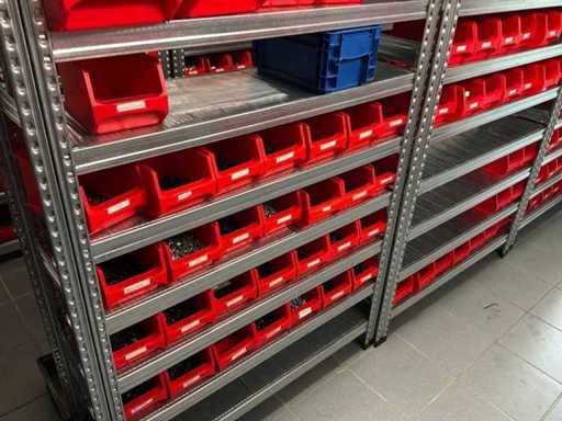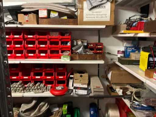 Bestehend aus: 12x Steckregalen mit Sichtlagerkästen und verschiedenen Inhalten wie Schrauben, Ersatzteile, Elektromaterial, u.v.m.