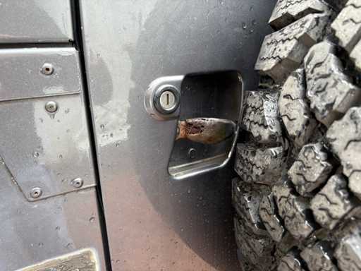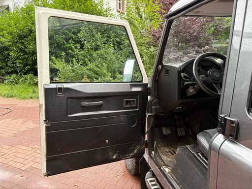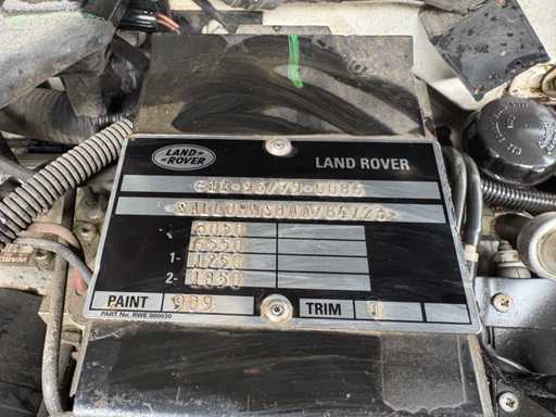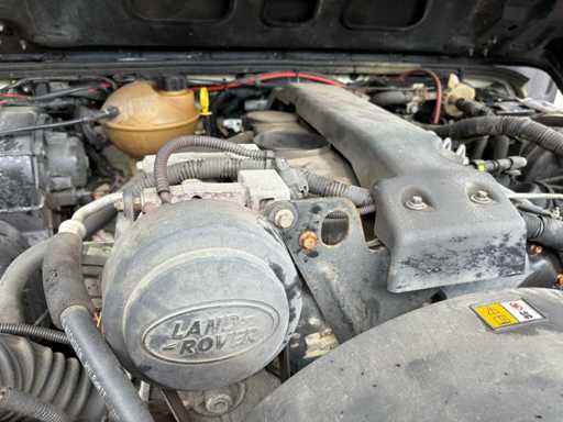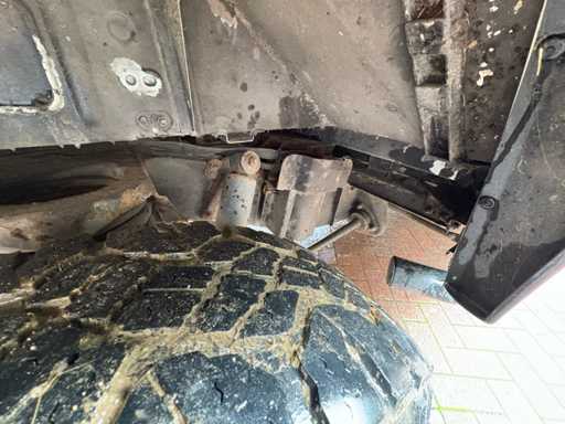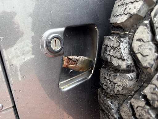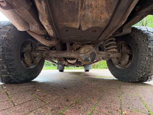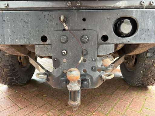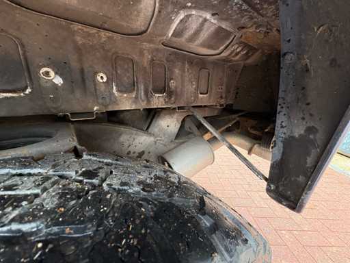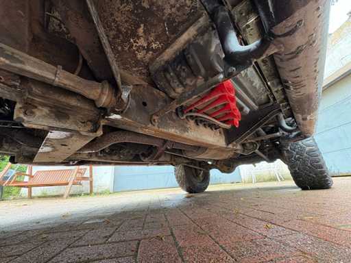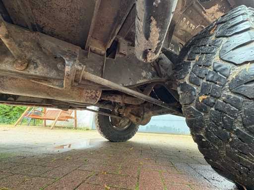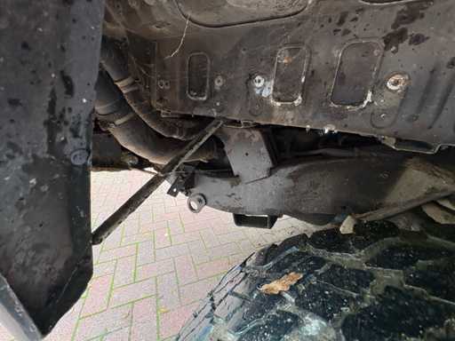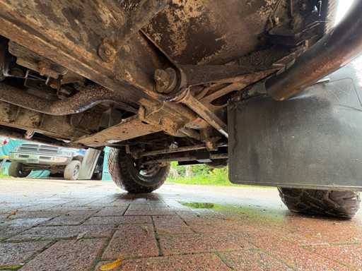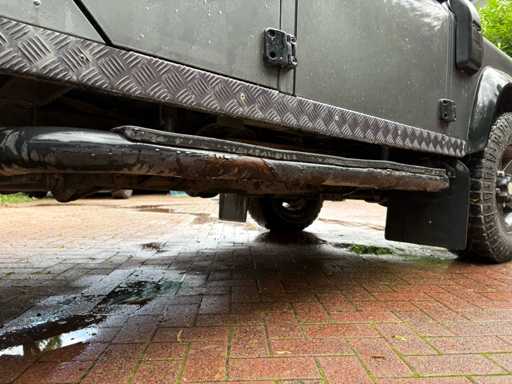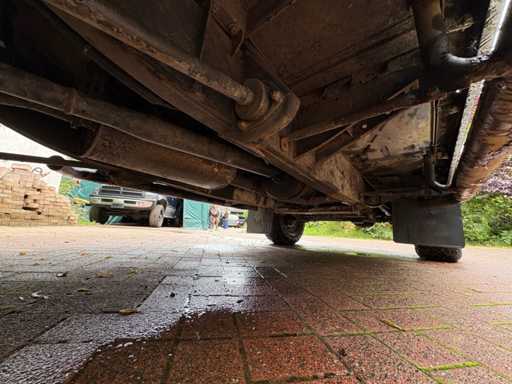 Das Fahrzeug ist voll funktionsfähig, Allradantrieb, Getriebe und Motor arbeiten wie erwartet. Der Defender zeigt starke Gebrauchsspuren am Rahmen, Fahrwerk und Unterboden – erkennbar ist eine signifikante Durchrostung des seitlichen Schwellerrohrs rechts. Weiterhin rostiger Zustand an mehreren Teilen des Fahrgestells, typisch für das Modell.