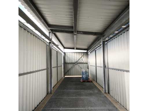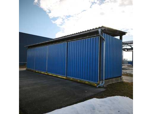 Material-/Lagerbehälter mit seitlichen Rolltüren auf beiden Seiten, verzinktes Stahlunterbauwerk mit blauen trapezförmigen Paneelen, montiert auf einem Betonsockel. Abmessungen LxWxH in cm 1200x345x350