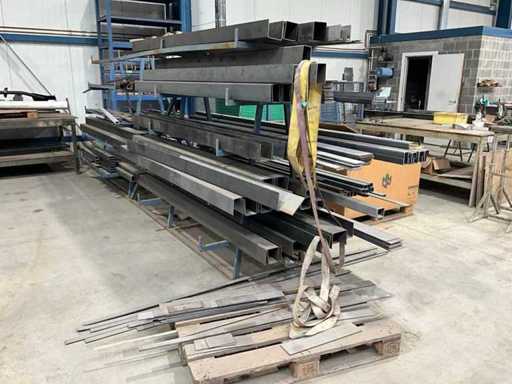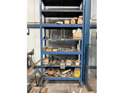 Bestehend aus einem Profilgestell mit dem Inhalt verschiedener Metallprofile und Glätteisen im und unter dem Gestell, +1x Metalllagerregal mit der Maße 700x1400x3050 mm mit dem Inhalt verschiedener Montagematerialien, + Pappe mit Pastore- und Lombarde-Türverschlusszubehör