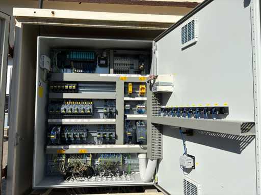 • Schaltschrank hat saubere Verdrahtung mit diversen Relais, Sicherungen und SPS-Komponenten.