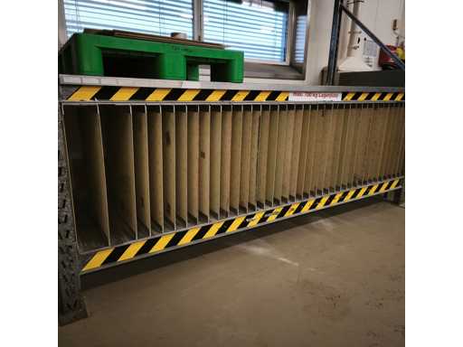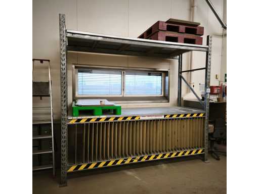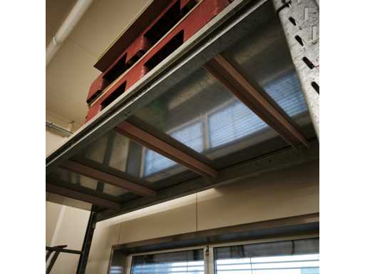 1x Schwerlastregale mit Stahlblechregalen, Tragfähigkeit pro Bucht 700 kg, Maße LxWxH in cm 286x102x260, 2x Aufrechte / 6x Querträger / jede Ebene mit abnehmbaren Zwischenquerträgern, 2x Stahlblechregale, 1x Systemebene