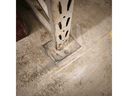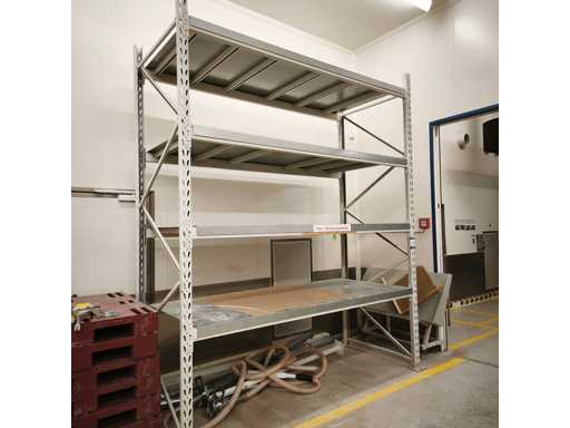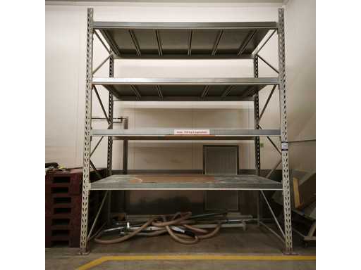 1x Schwerlastregale mit Stahlblechregalen, Tragfähigkeit pro Bucht 700 kg, Maße LxWxH in cm 285x117x310, 2x Aufrechter / 8x Querträger / jede Ebene mit abnehmbaren Zwischenträgern, 4x Stahlblechregale