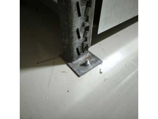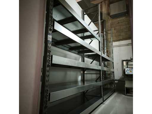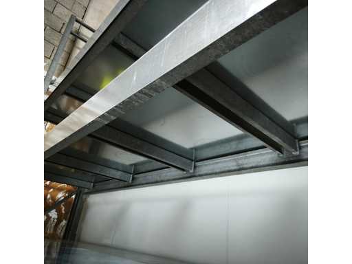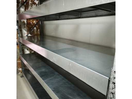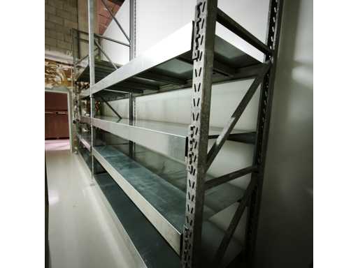 1x Robuste Regale mit Stahlblechregalen, Maße LxWxH in cm 560x84x400, Inhalt 3x Aufrechte / 18x Querträger / jede Ebene mit abnehmbaren Zwischenträgern, 9x Stahlblechregale