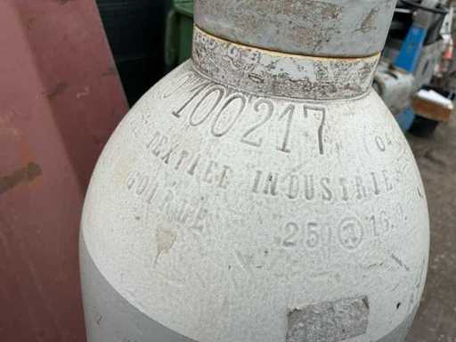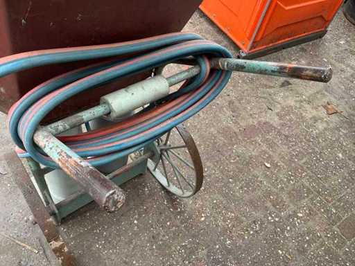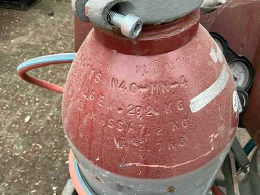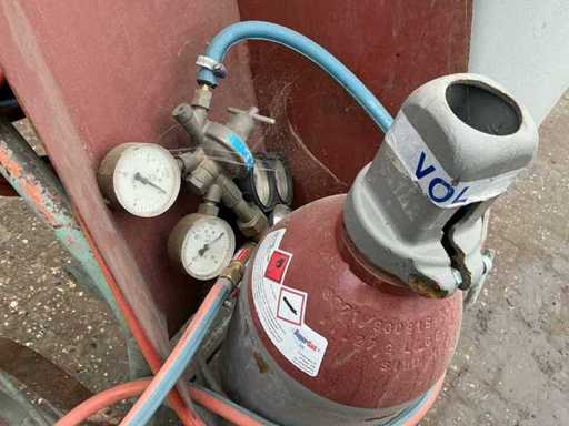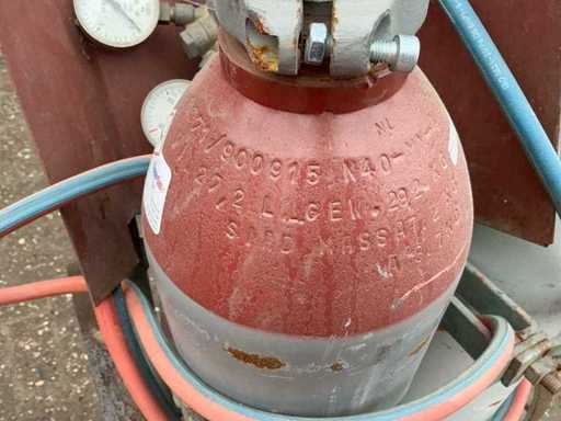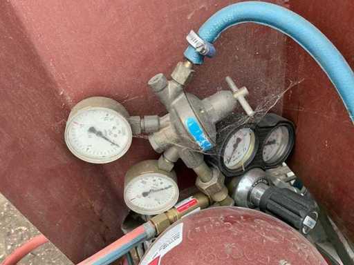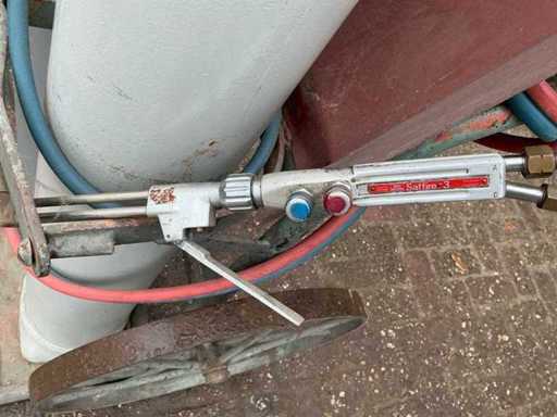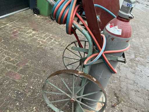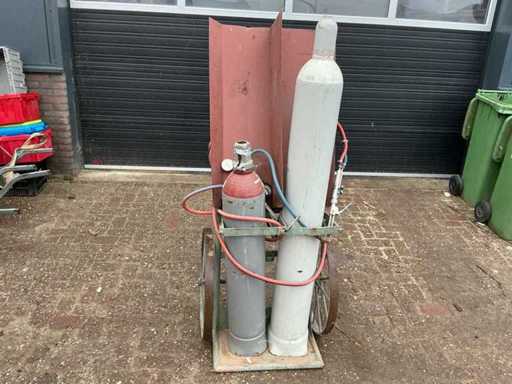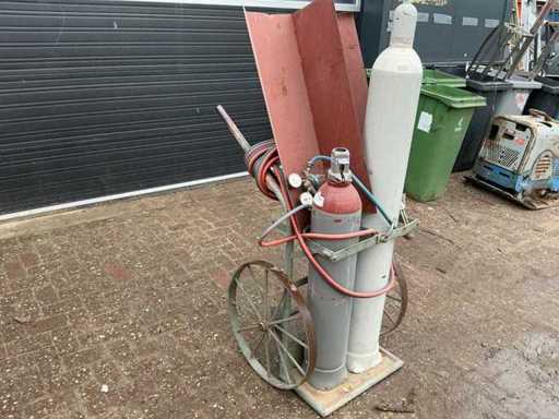 Ausgestattet mit: Sauerstoffflasche, Acetylenflasche, Schläuchen, Druckreglern, Schweißbrenner, Hitzeschild