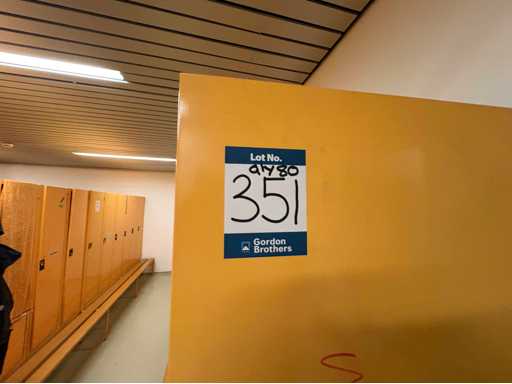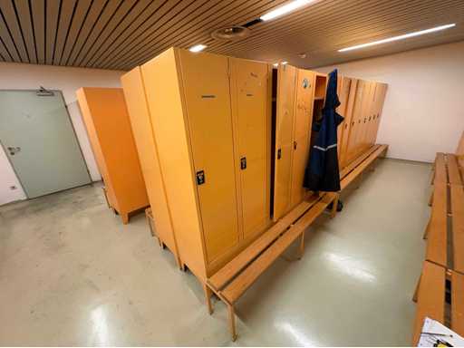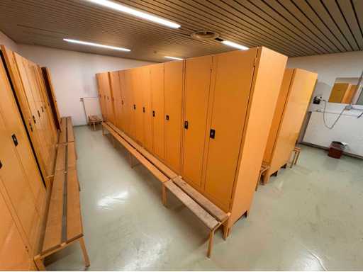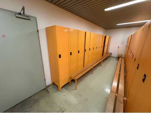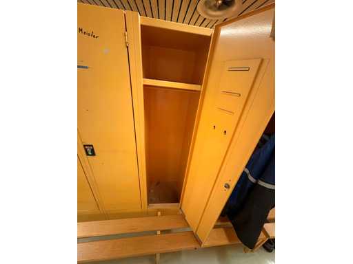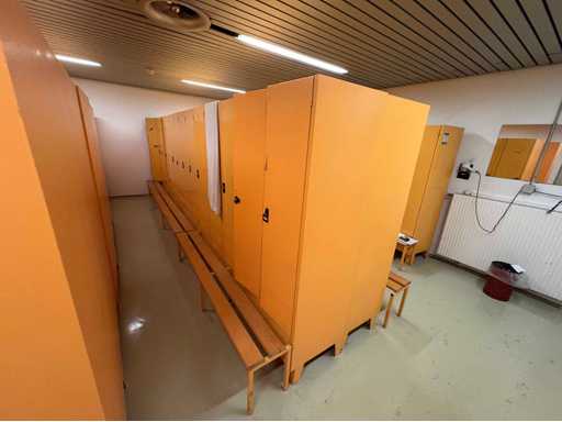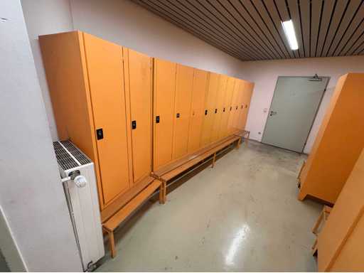 Achtzig lebensgroße orangefarbene Stahl-Personalspinde und eine niedrige Sitzbank, jeweils 1,85 m hoch × 400 mm breit.