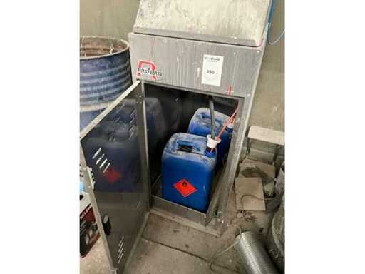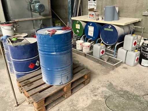 Komplett mit einer Charge leerer Dosen und 3 Fässer, die möglicherweise Seife, Schnelltrocknung, Spülverdünner, auf 3 Fässern und 3 leeren Fässern.