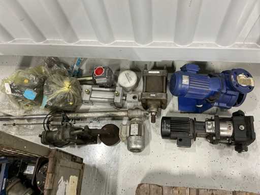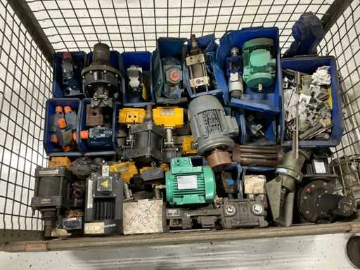Das Los besteht aus: (1x) Gitterbox mit verschiedenen Elektromotoren und Pumpen; (2x) ungenutzte Axialkolben-Pumpentyp: E-A10VSO von Travel Robot 985994.