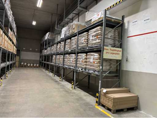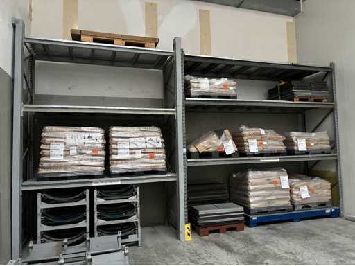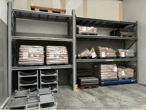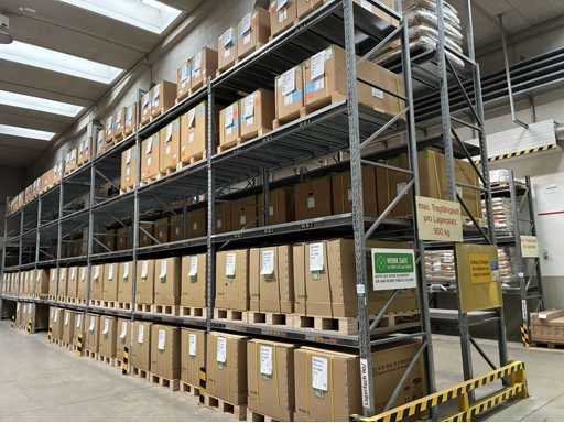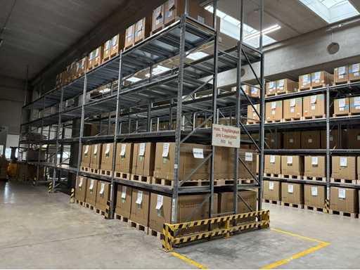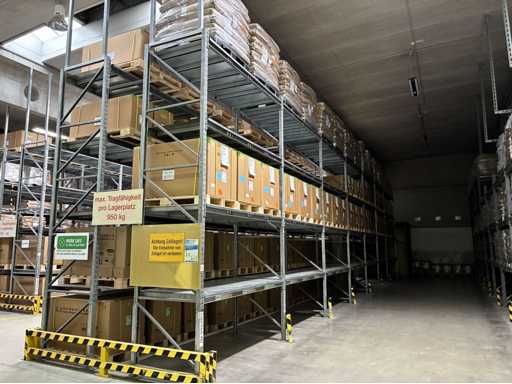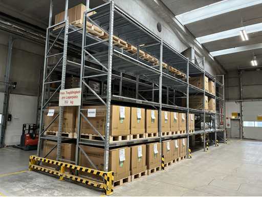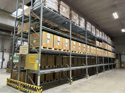 Vierzig Felder verzinkter bolzenloser Palettenregale mit Regalabdeckungen und Eck-Aufrechterschutz, bestehend aus 1 x Lauf mit 3 x Aufrechter 3,83 m (H) x 1,1 m (W) 16 x 2,7 m Querträgern. 1 x Lauf mit 5 aufrechten Stangen, 4,8 m (H) x 1,1 m (B), 24 x 2,7 m Querbalken. 8 x 3,9 m große Querbalken. 2 x Läufe mit insgesamt 13 x 4,8 m (H) x 1,1 m breiten Aufrechter, 88 x 2,7 m langen Querbalken. 2 x Läufe mit insgesamt 16 x 4,8 m (H) x 1,1 m breiten Querträgern, 16 x 3,9 m langen Querträgern und 96 x 2,7 m langen Querträgern. 1 x Lauf mit 9 x 4 m (H) aufrechten Stangen x 1,1 m (W) und 54 x 2,7 m langen Querbalken. außerdem 2 Felder bolzenloser Palettenregale mit 4 x 3,8 m (H) x 1,1 m Querträgern, 6 x 2,7 m langen Querträgern und 6 x 3,9 m langen Querträgern. Vermögenswert Nr. 307. Bitte beachten Sie, dass der Inhalt des Racks NICHT enthalten ist.