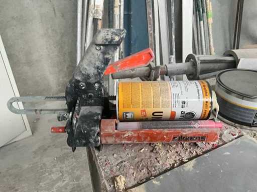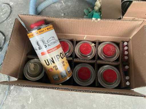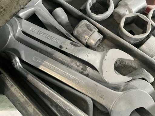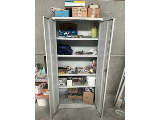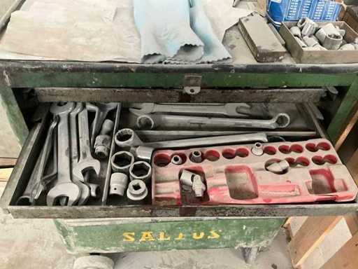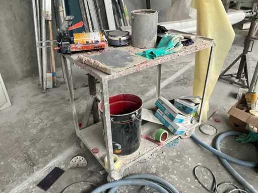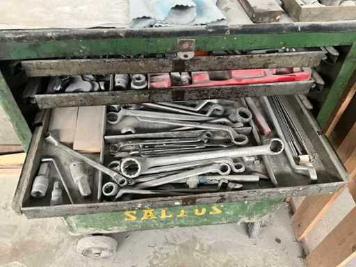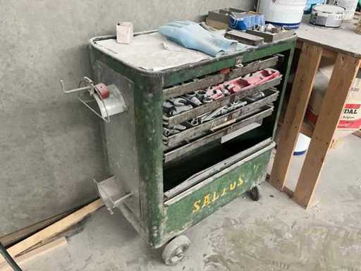 Bestehend aus Saltus-Werkzeugwagen, Aktenschrank, Transportwagen 100 x 55 x 90 cm, Holzwerkbank und Metallspender auf Achsstützen.